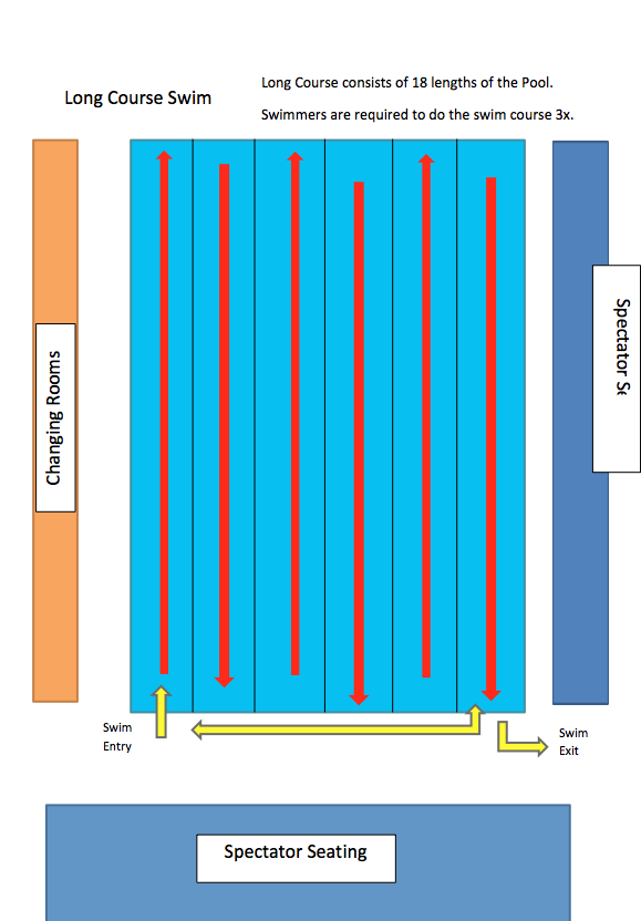 Long Course – For the long course you will swim two (2) x nine (9) lengths of the pool (a total of 18 lengths). This means that after nine (9) lengths, you get out of the pool and then swim another nine (9) lengths.